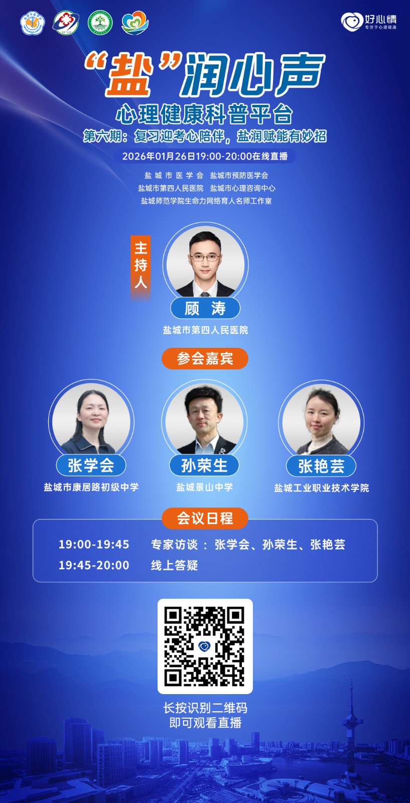 1月26日晚7点,盐城市第四人民医院顾涛医生携手三位一线教育嘉宾——张学会、孙荣生、张艳芸,围绕“复习迎考心陪伴”开展专题访谈与线上答疑。